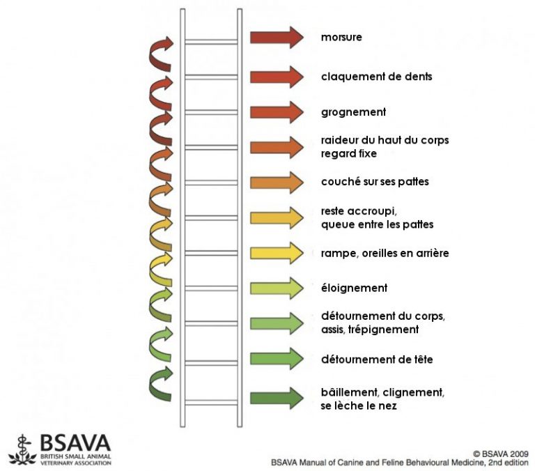 Cette échelle vous indique comment les chiens préviennent de leur état de mal être avant d’agresser. Autrement dit, avant de mordre, ils vont mettre en place plein de signaux pour vous avertir. Apprenez-les, respectez-les, ne grondez pas un chien qui prévient, et vous éviterez des incidents !